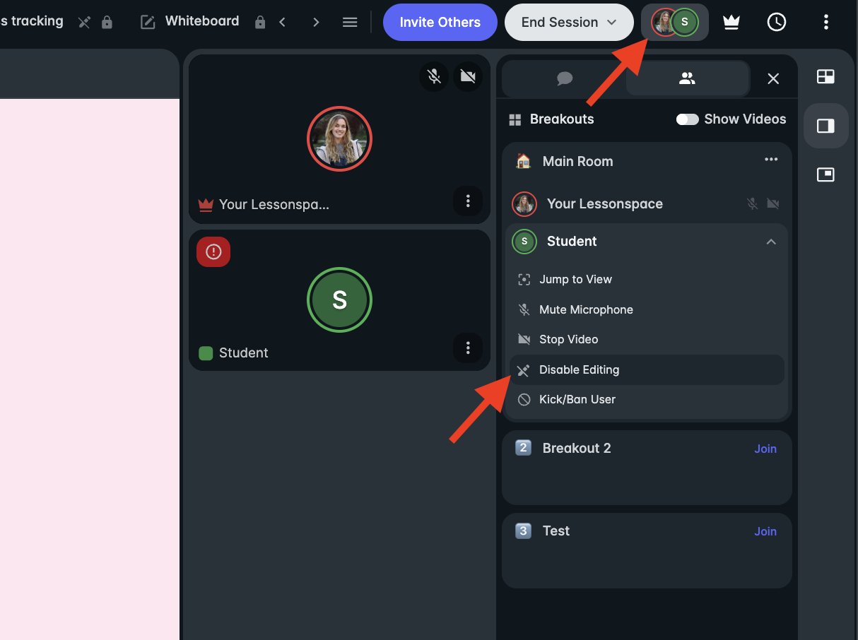 Disable Editing per student, to stop individual students to have edit access in the Space. This is quite handy to manage disruptive students or allow edit access to one student at a time.