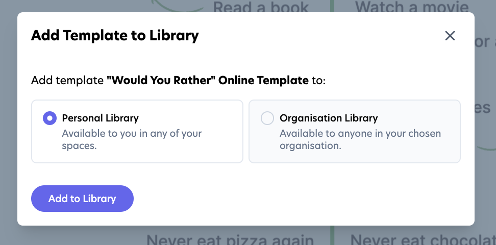 - Select Add to my library to save it for later use. (Choose whether to add it to your Personal Library or your Organization Library.)