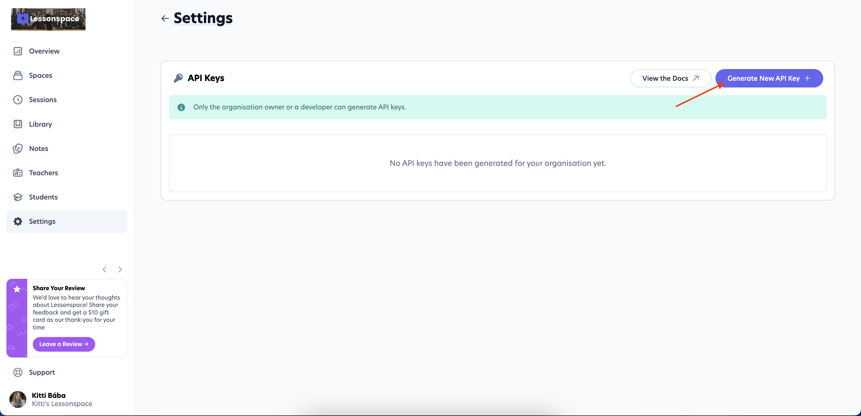 Note that only account owners and developer roles can generate a new API key. If you have any issues or need permissions to generate a key for your organisation, please reach out to us at support@thelessonspace.com