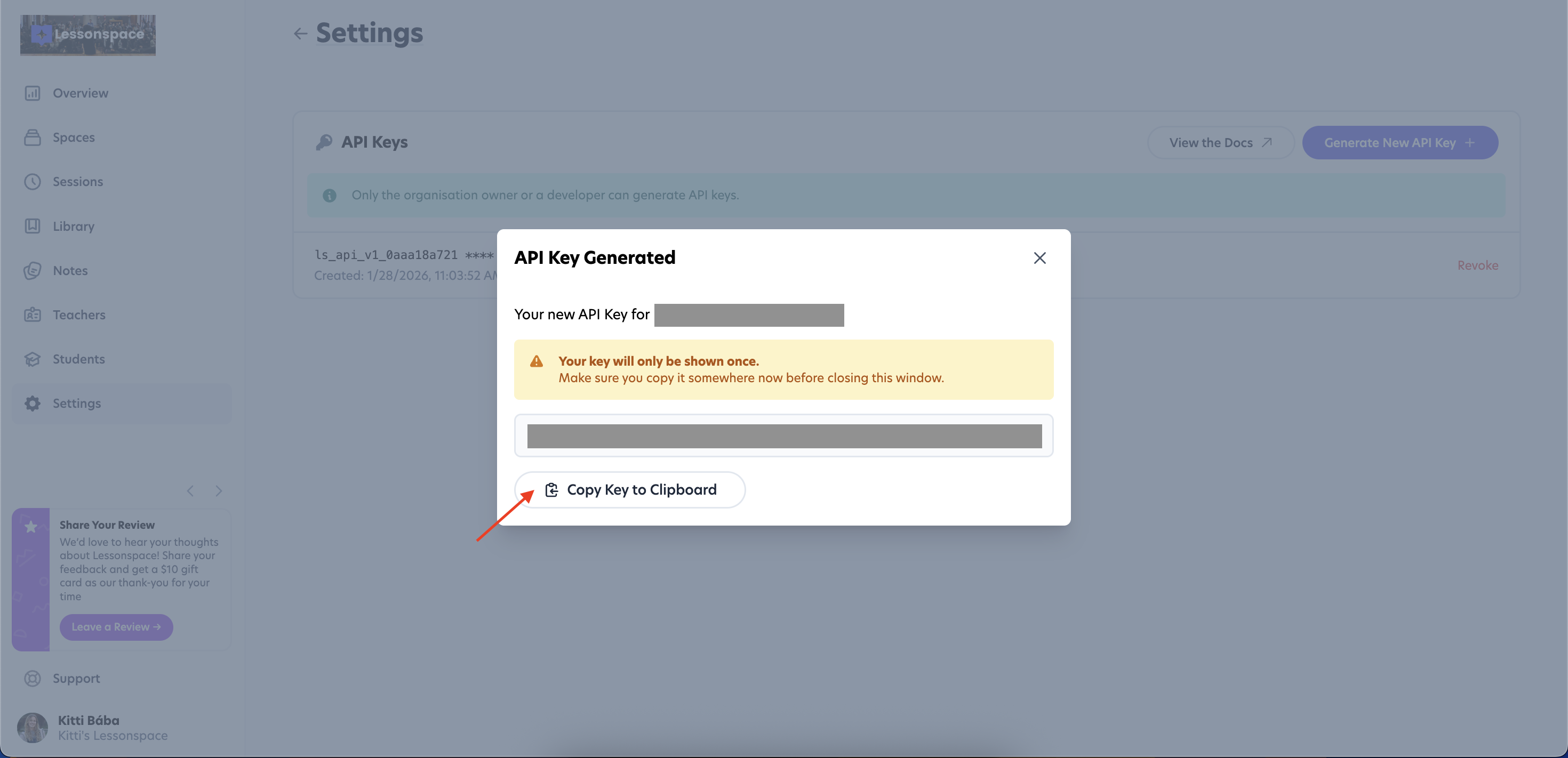 You or a developer may need to generate an API key to connect Lessonspace to other systems or to your own custom setup.
